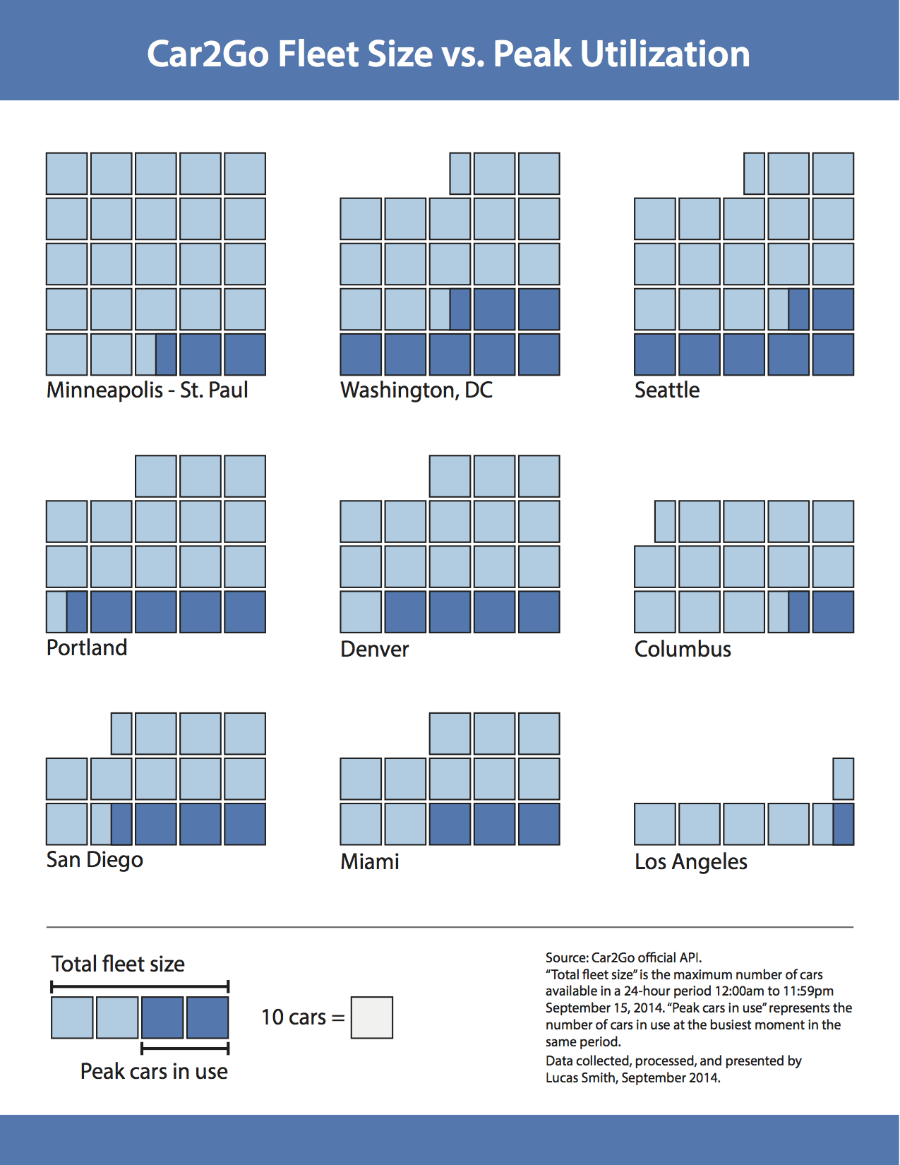 Where is car2go used the most? Where is it used the least? By tracking the utilization of car2go in multiple cities over the course of a 24-hour period, we can see which cities use the cars the most–and where the fleets might be excessive.