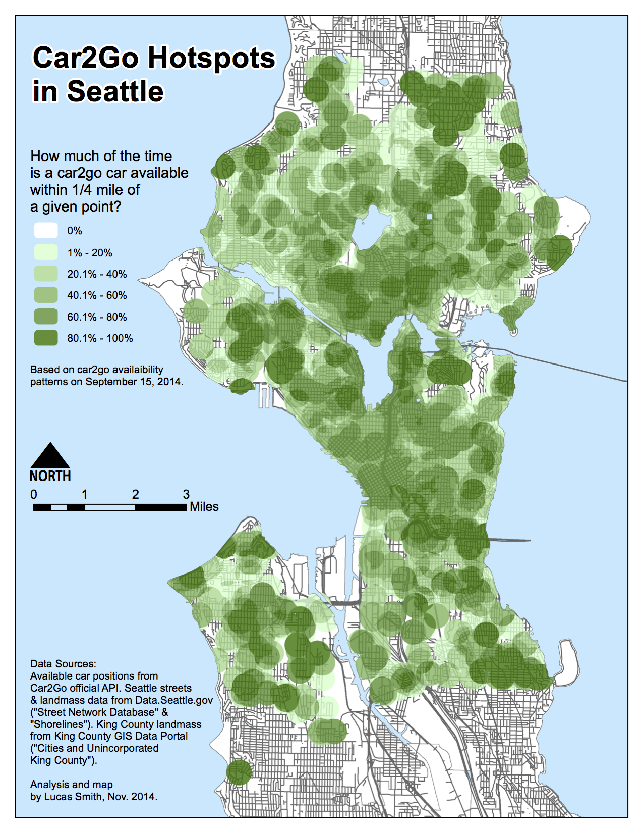 Based on data of positions of available car2go vehicles in the Seattle area. The colors indicate the percentage of the time a car2go car was available in the colored area.